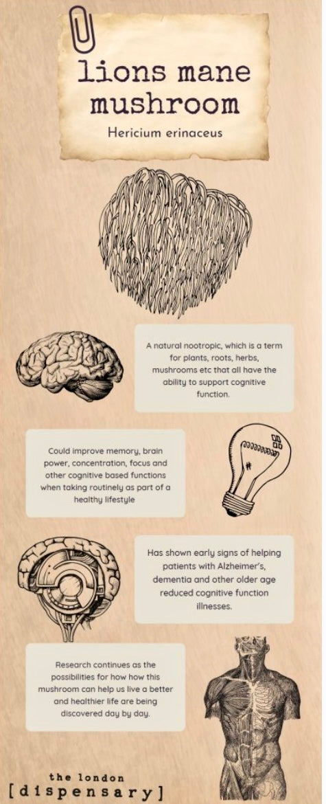 It produces two families of compounds: erinacines and the hericenones. These compounds are important for nerve growth factor (NGF), aiding in learning and memory. Hericium has the amazing ability to pass through the blood-brain barrier, stimulating the growth of neurons and protective cells. This means it can improve overall mental performance.